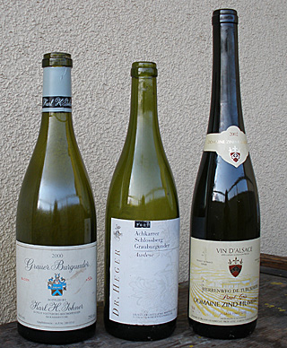 Mit stolzen 915 Gramm Leergewicht war der Grauburgunder SJ vom Weingut Johner aus dem Kaiserstuhl eindeutig das gr??te Schwergewicht dieser Probe. Beim Inhalt hatten allerdings zwei weitere gewichtige Weine beiderseits des Rheins ein W?rtchen mitzureden. Ausdauer war hier gefragt, schlie?lich geht nicht nur so manchem Grauburgunder nach mehr als 10 Jahren schon mal die Puste aus.