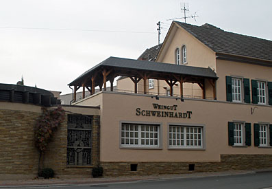 Mit 33 Hektar ist das mitten im Ort gelegene Gut Schweinhart zweifellos eines der gro?en. Die unterschiedlichen B?den bringen dabei ganz unterschiedliche Weincharaktere hervor. Sch?n zu „erschmecken“ ist das bei den Rieslingen, von denen vor allem die preisgekr?nte Riesling Terrasse vom Langenlonsheimer Rothenberg 2008 (88+ Punkte) aus dem Rotschieferboden zu nennen ist. F?r unter 10 ? ist besonders der Wei?e Burgunder vom L?hrer Berg (87 Punkte) erw?hnenswert, der dem Grauburgunder um mehr als eine Nasenl?nge voraus ist. Auch auf den Sp?tburgunder versteht man sich hier – bei sehr zur?ckhaltenden Preisen. Schon der einfache 2007er ?berzeugt mit feiner Frucht (86 Punkte) und der Barrique-Sp?tburgunder 2007 fasziniert mit ausgepr?gter Nase und sch?ner Aromenf?lle (88 Punkte). Und das nicht mal f?r 10 Euro! Vieles g?be es hier noch zu entdecken (Cabernet, Merlot, Fr?hburgunder, au?erdem verschiedene edels??e Weine und Br?nde…).